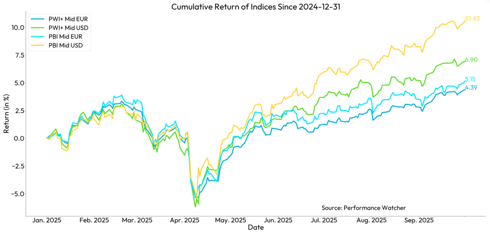 2025 dürfte sich für Anleger als gutes Jahr erweisen, da sich der positive Trend der vergangenen Monate fortzusetzen scheint. Die Portfolios der PW-Community weisen komfortable Zuwächse auf – trotz niedriger Anleiherenditen und der Stärke der Schweizer und europäischen Währungen.