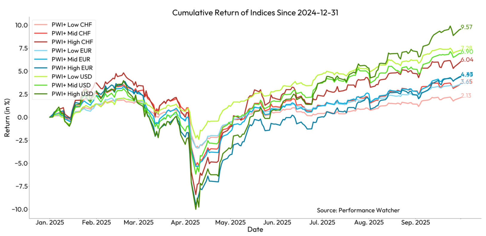 Vor diesem Hintergrund stieg die Performance der Portfolios der Manager auf der Plattform Performance Watcher zwischen Ende Juni und Ende September weiter an, wobei die Performance zwischen 1,71 % für das risikoarme CHF-Profil und 5,56 % für das risikoreiche USD-Profil lag.